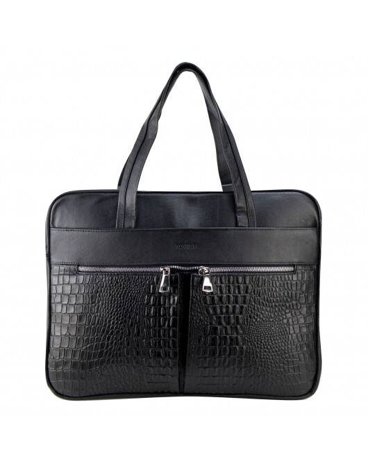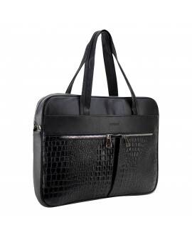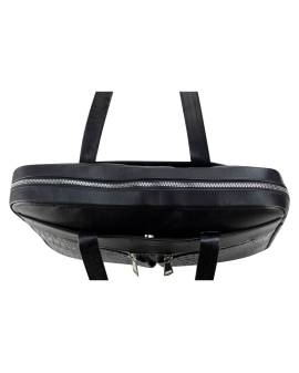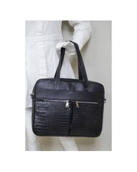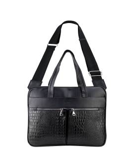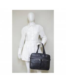 Portafolio, 100% piel color negro, con aplicaciones en grabado cocodrilo y herrajes niquel. Cuenta con tres bolsas internas y cuatro más externas, además de tener un asa extra ajustable según la necesidad de la persona.